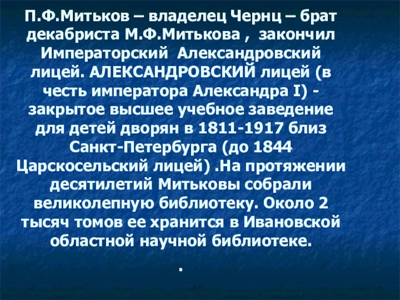Слайд 12П.Ф.Митьков – владелец Чернц – брат декабриста М.Ф.Митькова , закончил Императорский