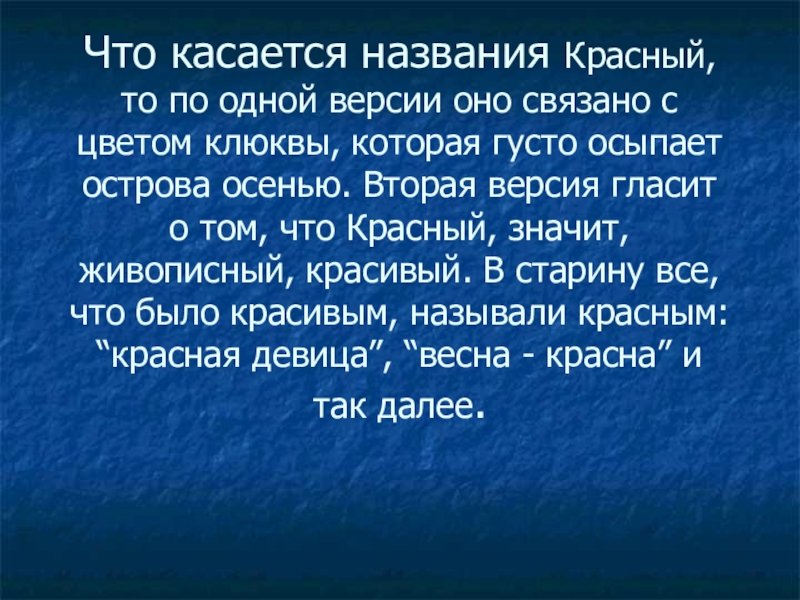цветом клюквы, которая густо осыпает острова осенью. Вторая версия гласит о том, что Красный, значит, живописный, красивый. В старину все, что было красивым, называли красным: “красная девица”, “весна - красна” и так далее.