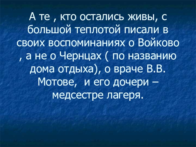 своих воспоминаниях о Войково , а не о Чернцах ( по названию дома отдыха), о враче В.В.Мотове, и его дочери – медсестре лагеря.