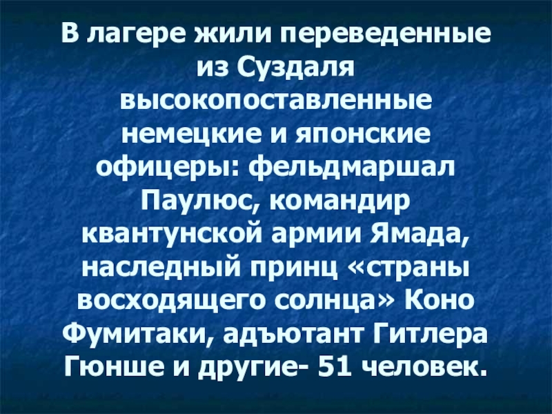 Слайд 41В лагере жили переведенные из Суздаля высокопоставленные немецкие и японские