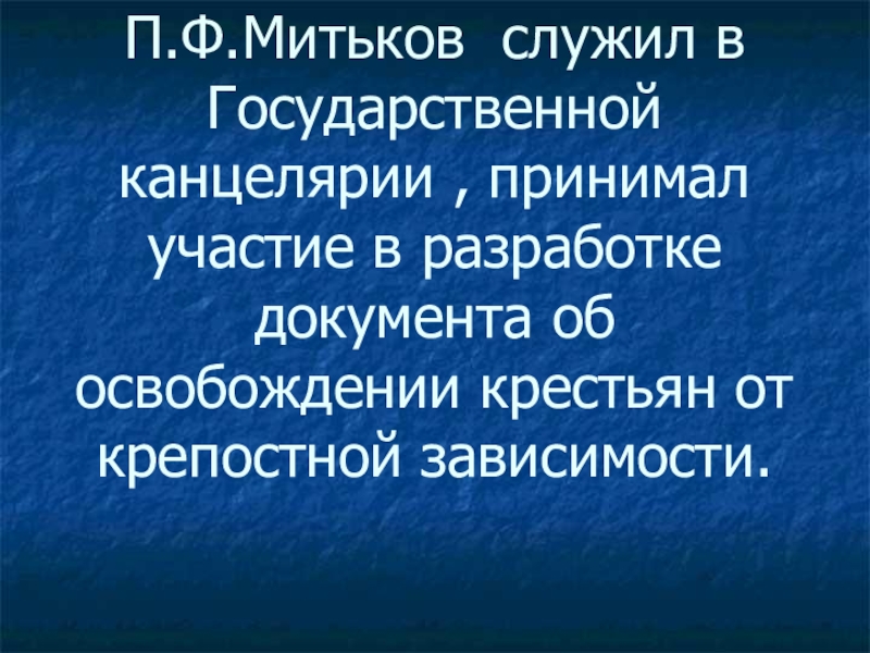 Слайд 16П.Ф.Митьков служил в Государственной канцелярии , принимал участие в разработке документа