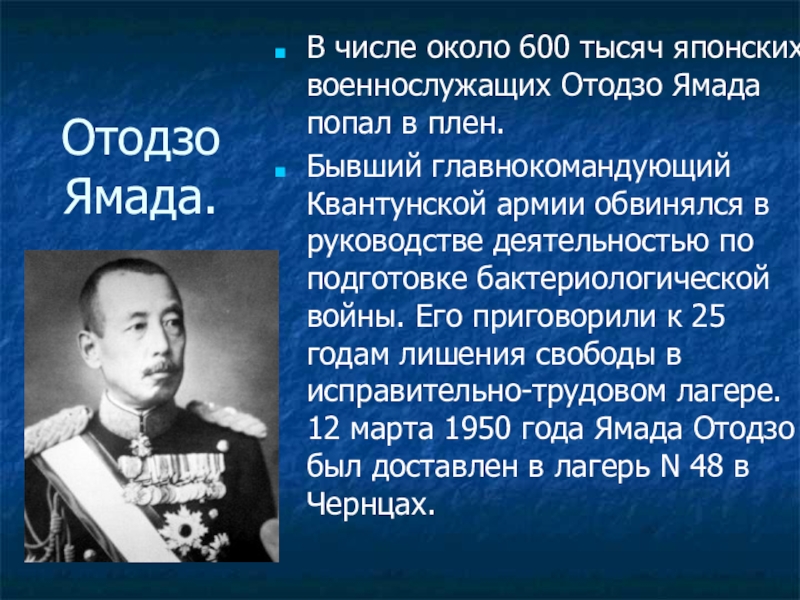 Бывший главнокомандующий Квантунской армии обвинялся в руководстве деятельностью по подготовке бактериологической войны. Его приговорили к 25 годам лишения свободы в исправительно-трудовом лагере. 12 марта 1950 года Ямада Отодзо был доставлен в лагерь N 48 в Чернцах.