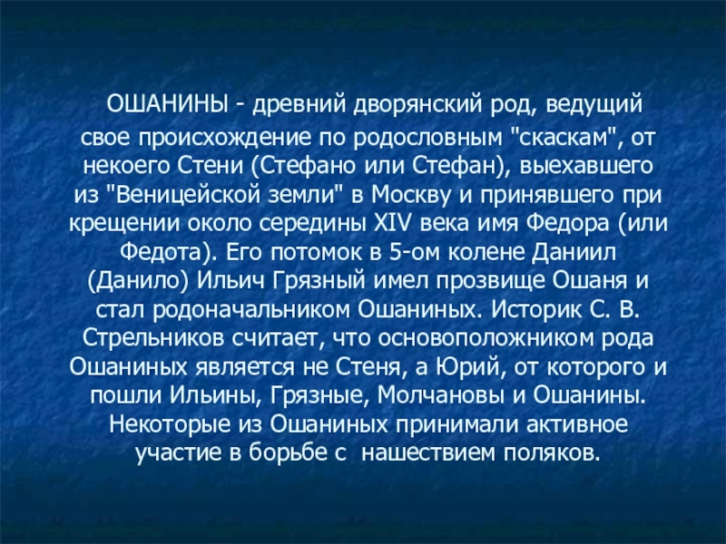 "скаскам", от некоего Стени (Стефано или Стефан), выехавшего из "Веницейской земли" в Москву и принявшего при крещении около середины XIV века имя Федора (или Федота). Его потомок в 5-ом колене Даниил (Данило) Ильич Грязный имел прозвище Ошаня и стал родоначальником Ошаниных. Историк С. В. Стрельников считает, что основоположником рода Ошаниных является не Стеня, а Юрий, от которого и пошли Ильины, Грязные, Молчановы и Ошанины. Некоторые из Ошаниных принимали активное участие в борьбе с нашествием поляков.