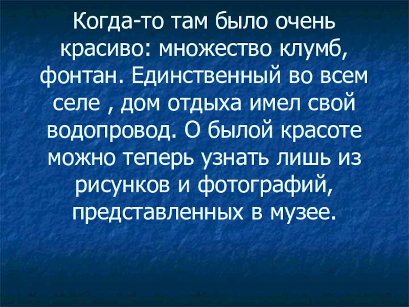 Слайд 38Когда-то там было очень красиво: множество клумб, фонтан. Единственный во всем