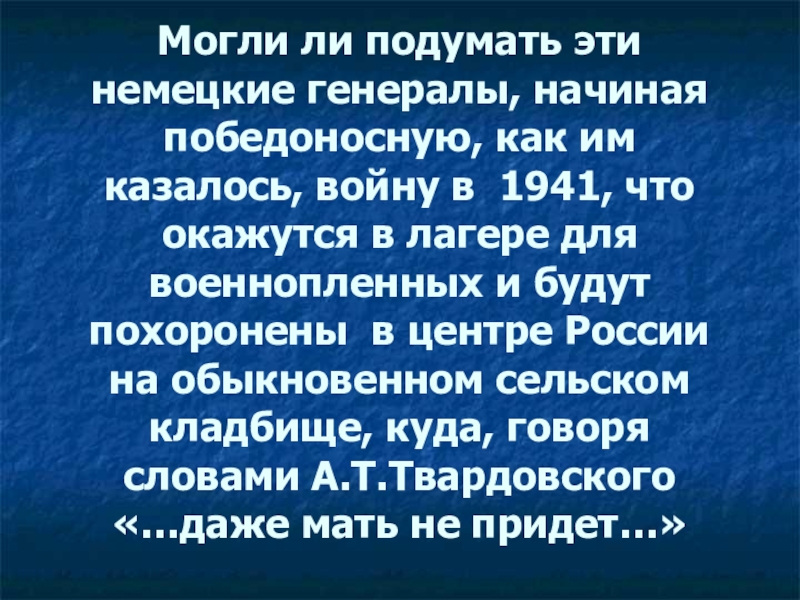 войну в 1941, что окажутся в лагере для военнопленных и будут похоронены в центре России на обыкновенном сельском кладбище, куда, говоря словами А.Т.Твардовского «…даже мать не придет…»