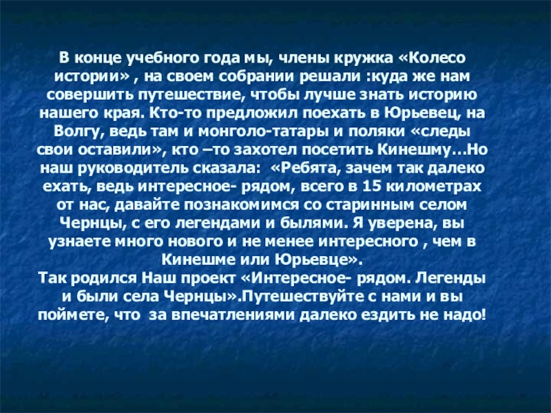 своем собрании решали :куда же нам совершить путешествие, чтобы лучше знать историю нашего края. Кто-то предложил поехать в Юрьевец, на Волгу, ведь там и монголо-татары и поляки «следы свои оставили», кто –то захотел посетить Кинешму…Но наш руководитель сказала: «Ребята, зачем так далеко ехать, ведь интересное- рядом, всего в 15 километрах от нас, давайте познакомимся со старинным селом Чернцы, с его легендами и былями. Я уверена, вы узнаете много нового и не менее интересного , чем в Кинешме или Юрьевце».