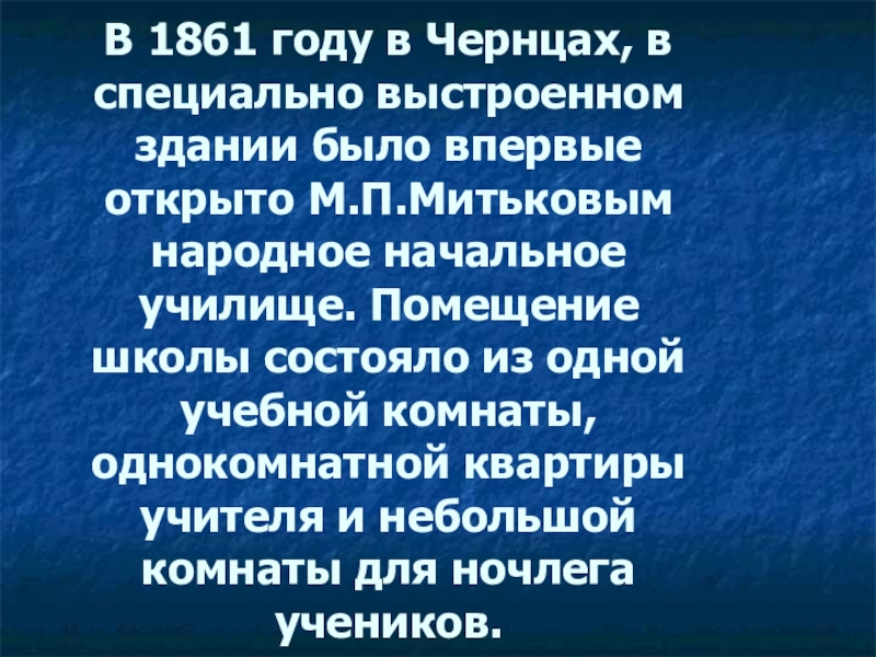 открыто М.П.Митьковым народное начальное училище. Помещение школы состояло из одной учебной комнаты, однокомнатной квартиры учителя и небольшой комнаты для ночлега учеников.