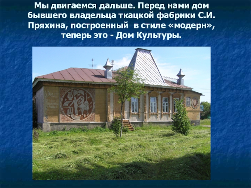 Слайд 54Мы двигаемся дальше. Перед нами дом бывшего владельца ткацкой фабрики С.И.Пряхина,