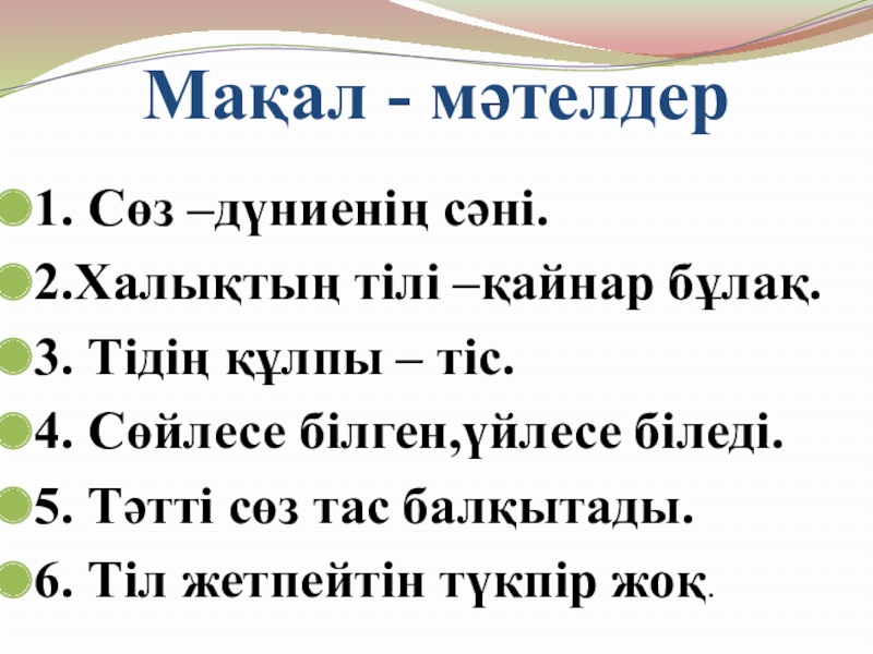 Мақал - мәтелдер1. Сөз –дүниенің сәні.2.Халықтың тілі –қайнар бұлақ.3. Тідің құлпы – тіс.4.