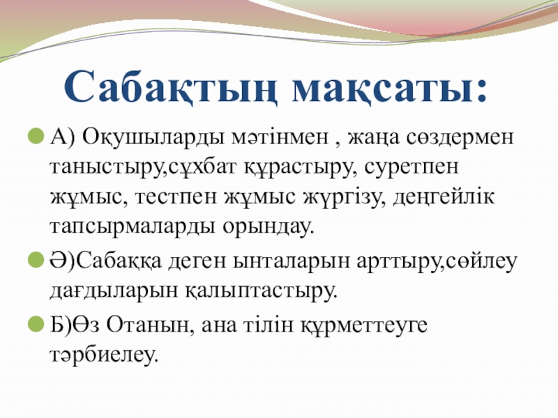 Сабақтың мақсаты:А) Оқушыларды мәтінмен , жаңа сөздермен таныстыру,сұхбат құрастыру, суретпен жұмыс, тестпен жұмыс жүргізу, деңгейлік тапсырмаларды орындау.Ә)Сабаққа деген ынталарын арттыру,сөйлеу дағдыларын қалыптастыру.Б)Өз Отанын, ана тілін құрметтеуге тәрбиелеу.