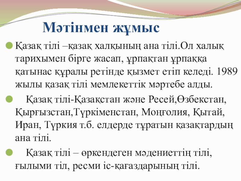 Мәтінмен жұмысҚазақ тілі –қазақ халқының ана тілі.Ол халық тарихымен бірге жасап, ұрпақтан ұрпаққа