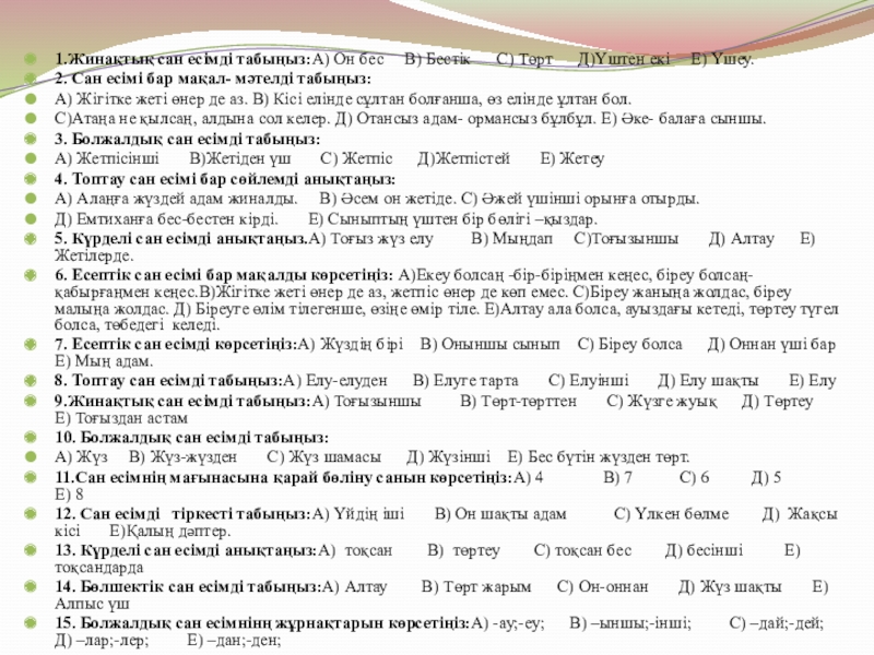 1.Жинақтық сан есімді табыңыз:А) Он бес   В) Бестік   С) Төрт   Д)Үштен