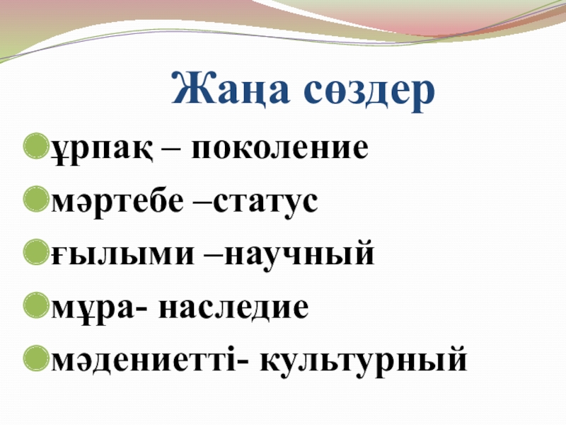 Жаңа сөздерұрпақ – поколениемәртебе –статусғылыми –научныймұра- наследиемәдениетті- культурный