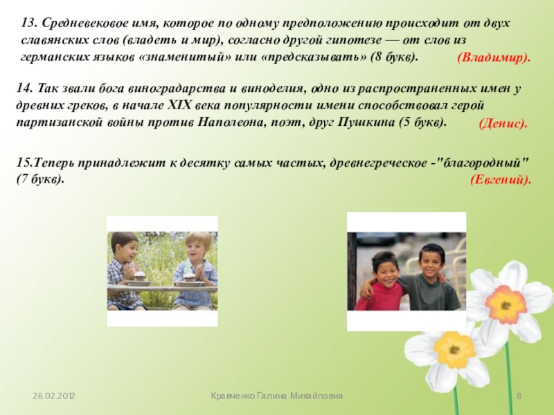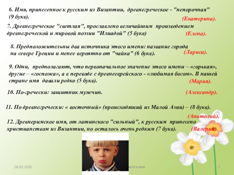 12. Древнеримское имя, от латинского "сильный", к русским принесено христианством из Византии, но осталось очень редким (7 букв).