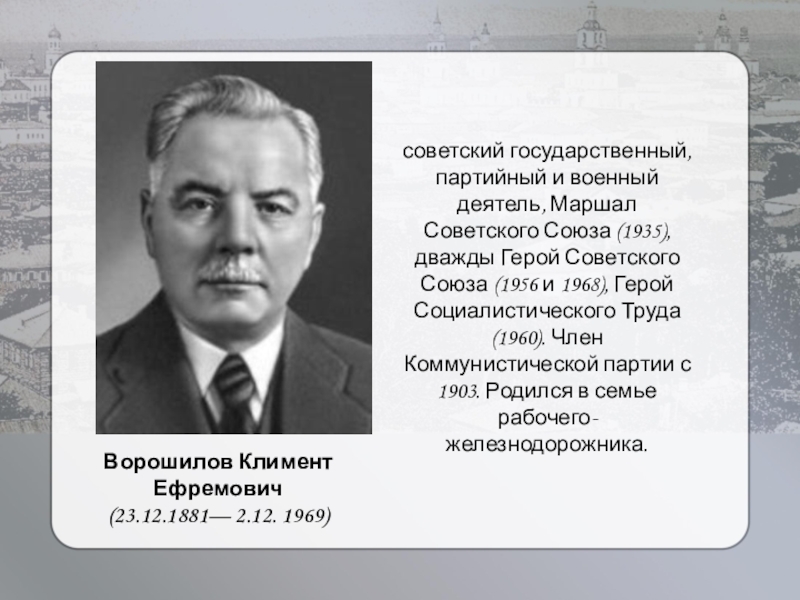Маршал Советского Союза (1935), дважды Герой Советского Союза (1956 и 1968), Герой Социалистического Труда (1960). Член Коммунистической партии с 1903. Родился в семье рабочего-железнодорожника.