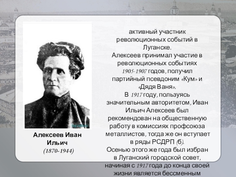 В 1917 году, пользуясь значительным авторитетом, Иван Ильич Алексеев был рекомендован на общественную работу в комиссиях профсоюза металлистов, тогда же он вступает в ряды РСДРП (б).