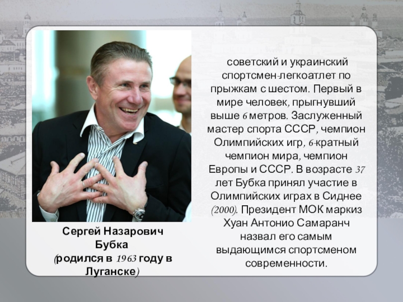 спортсмен-легкоатлет по прыжкам с шестом. Первый в мире человек, прыгнувший выше 6 метров. Заслуженный мастер спорта СССР, чемпион Олимпийских игр, 6-кратный чемпион мира, чемпион Европы и СССР. В возрасте 37 лет Бубка принял участие в Олимпийских играх в Сиднее (2000). Президент МОК маркиз Хуан Антонио Самаранч назвал его самым выдающимся спортсменом современности.