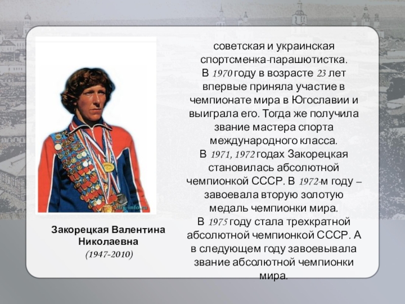 В 1971, 1972 годах Закорецкая становилась абсолютной чемпионкой СССР. В 1972-м году – завоевала вторую золотую медаль чемпионки мира.