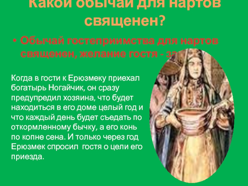 Когда в гости к Ерюзмеку приехал богатырь Ногайчик, он сразу предупредил хозяина, что будет находиться в его доме целый год и что каждый день будет съедать по откормленному бычку, а его конь по копне сена. И только через год Ерюзмек спросил гостя о цели его приезда.
