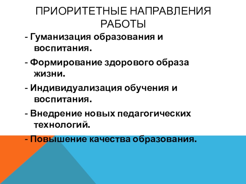 Приоритетные направления работы- Гуманизация образования и воспитания.- Формирование здорового образа жизни.- Индивидуализация обучения и воспитания.- Внедрение новых