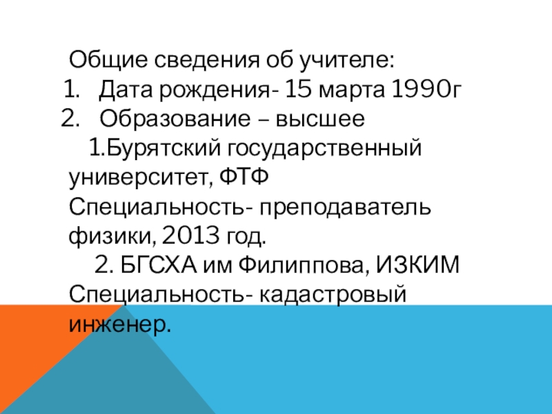Общие сведения об учителе:Дата рождения- 15 марта 1990гОбразование – высшее 1.Бурятский государственный университет, ФТФСпециальность- преподаватель физики, 2013 год. 2. БГСХА им Филиппова, ИЗКИМСпециальность- кадастровый инженер.