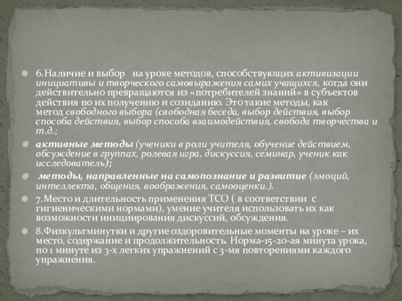 Слайд 66.Наличие и выбор на уроке методов, способствующих активизации инициативы и творческого