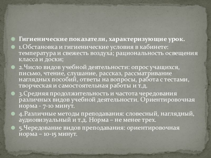 Слайд 5Гигиенические показатели, характеризующие урок.