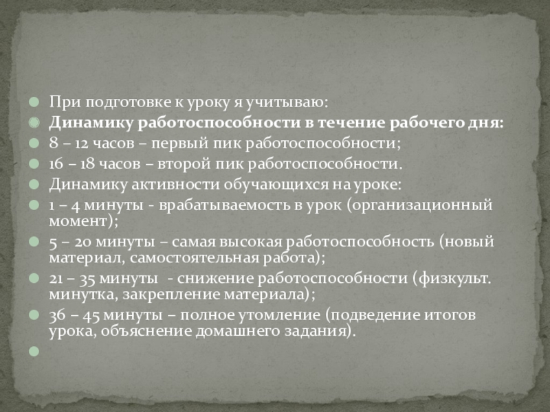 36 – 45 минуты – полное утомление (подведение итогов урока, объяснение домашнего задания).