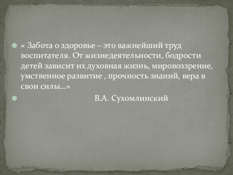 Слайд 2« Забота о здоровье – это важнейший труд воспитателя. От жизнедеятельности,