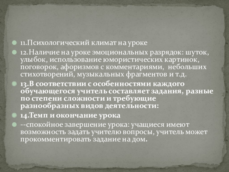 12.Наличие на уроке эмоциональных разрядок: шуток, улыбок, использование