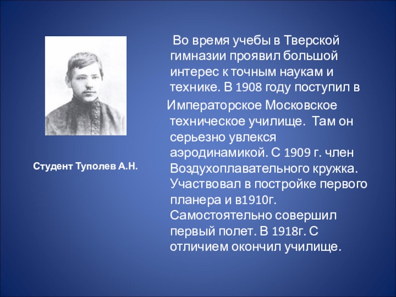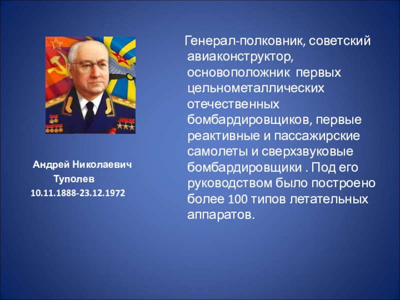 Генерал-полковник, советский авиаконструктор, основоположник первых цельнометаллических отечественных бомбардировщиков, первые реактивные и пассажирские самолеты и сверхзвуковые бомбардировщики . Под его руководством было построено более 100 типов летательных аппаратов.