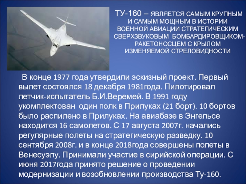 ТУ-160 – ЯВЛЯЕТСЯ САМЫМ КРУПНЫМ И САМЫМ МОЩНЫМ В ИСТОРИИ ВОЕННОЙ АВИАЦИИ СТРАТЕГИЧЕСКИМ СВЕРХЗВУКОВЫМ БОМБАРДИРОВЩИКОМ-РАКЕТОНОСЦЕМ С КРЫЛОМ ИЗМЕНЯЕМОЙ СТРЕЛОВИДНОСТИ