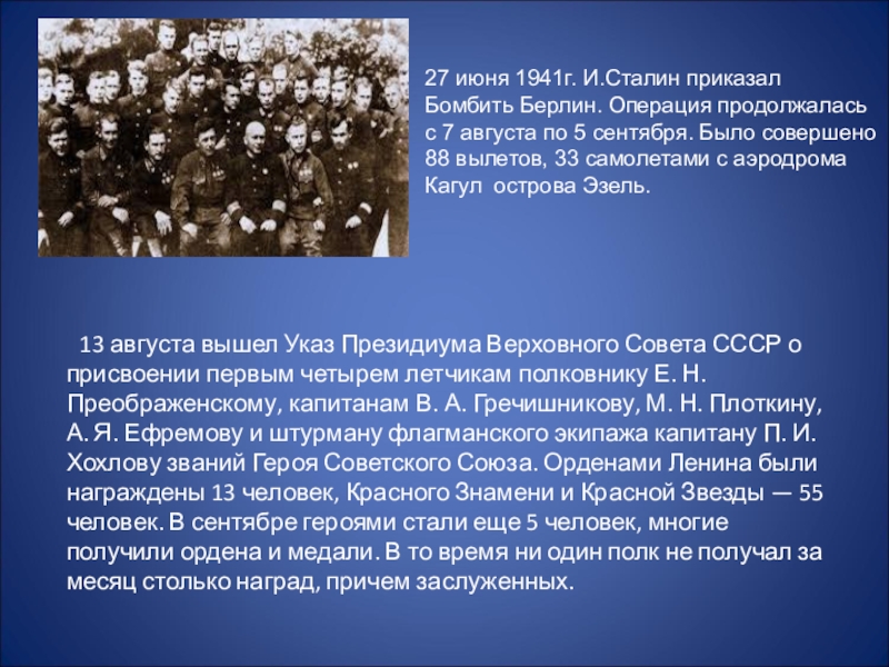 Бомбить Берлин. Операция продолжалась с 7 августа по 5 сентября. Было совершено 88 вылетов, 33 самолетами с аэродрома Кагул острова Эзель.