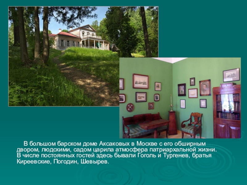 обширным двором, людскими, садом царила атмосфера патриархальной жизни. В числе постоянных гостей здесь бывали Гоголь и Тургенев, братья Киреевские, Погодин, Шевырев.