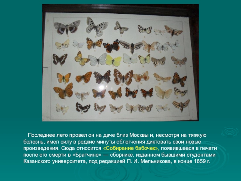 близ Москвы и, несмотря на тяжкую болезнь, имел силу в редкие минуты облегчения диктовать свои новые произведения. Сюда относится «Собирание бабочек», появившееся в печати после его смерти в «Братчине» — сборнике, изданном бывшими студентами Казанского университета, под редакцией П. И. Мельникова, в конце 1859 г.