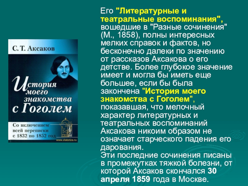 (М., 1858), полны интересных мелких справок и фактов, но бесконечно далеки по значению от рассказов Аксакова о его детстве. Более глубокое значение имеет и могла бы иметь еще большее, если бы была закончена "История моего знакомства с Гоголем", показавшая, что мелочный характер литературных и театральных воспоминаний Аксакова никоим образом не означает старческого падения его дарования.