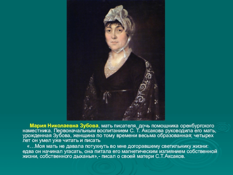 дочь помощника оренбургского наместника. Первоначальным воспитанием С. Т. Аксакова руководила его мать, урожденная Зубова, женщина по тому времени весьма образованная; четырех лет он умел уже читать и писать