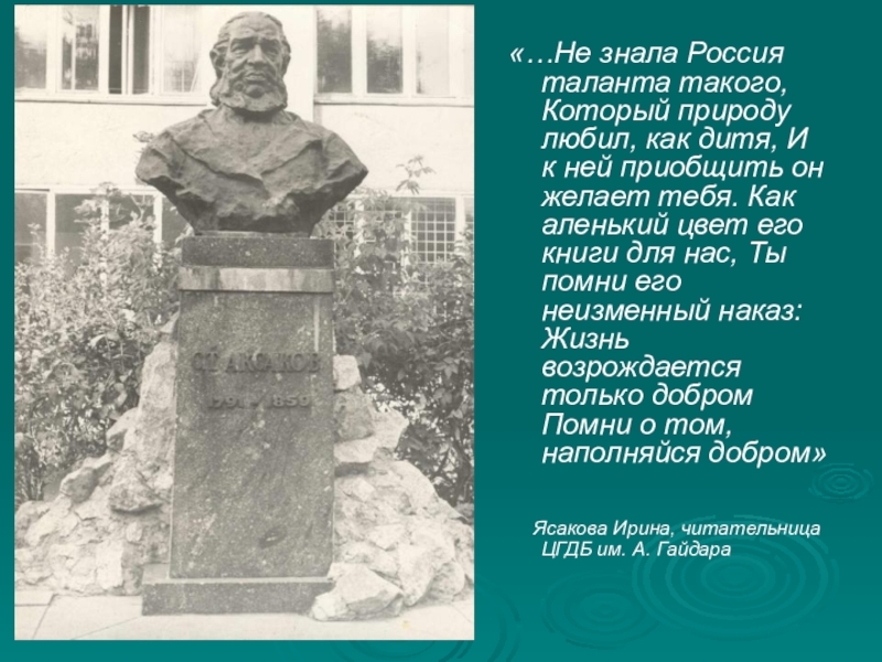 к ней приобщить он желает тебя. Как аленький цвет его книги для нас, Ты помни его неизменный наказ: Жизнь возрождается только добром Помни о том, наполняйся добром»