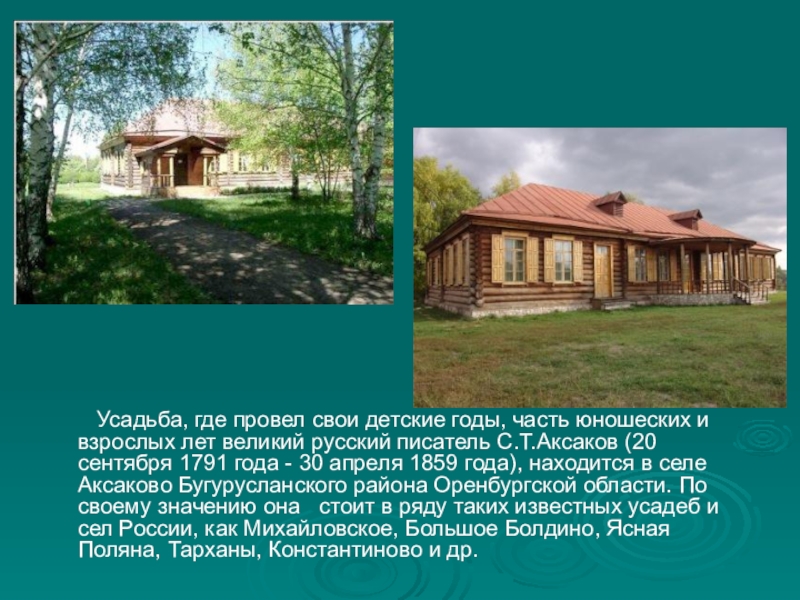 юношеских и взрослых лет великий русский писатель С.Т.Аксаков (20 сентября 1791 года - 30 апреля 1859 года), находится в селе Аксаково Бугурусланского района Оренбургской области. По своему значению она стоит в ряду таких известных усадеб и сел России, как Михайловское, Большое Болдино, Ясная Поляна, Тарханы, Константиново и др.