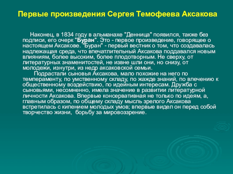 в 1834 году в альманахе "Денница" появился, также без подписи, его очерк "Буран". Это - первое произведение, говорящее о настоящем Аксакове. "Буран" - первый вестник о том, что создавалась надлежащая среда, что впечатлительный Аксакова поддавался новым влияниям, более высоким, более плодотворным. Не сверху, от литературных знаменитостей, не извне шли они, но снизу, от молодежи, изнутри, из недр аксаковской семьи.