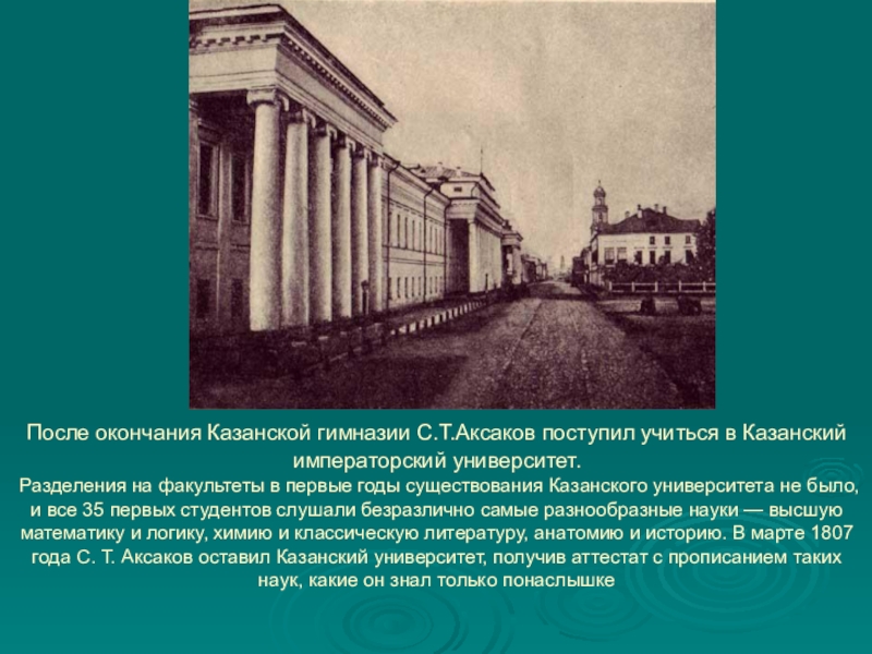 Слайд 6После окончания Казанской гимназии С.Т.Аксаков поступил учиться в Казанский императорский университет.
