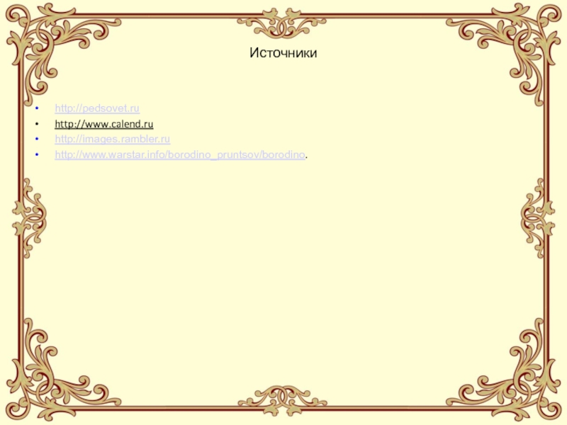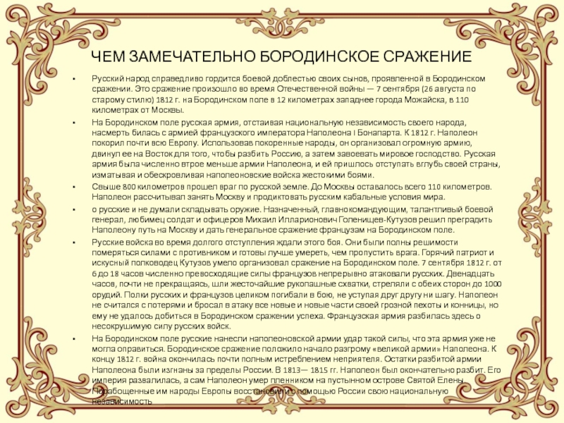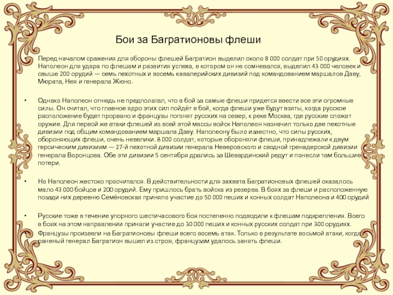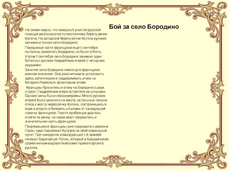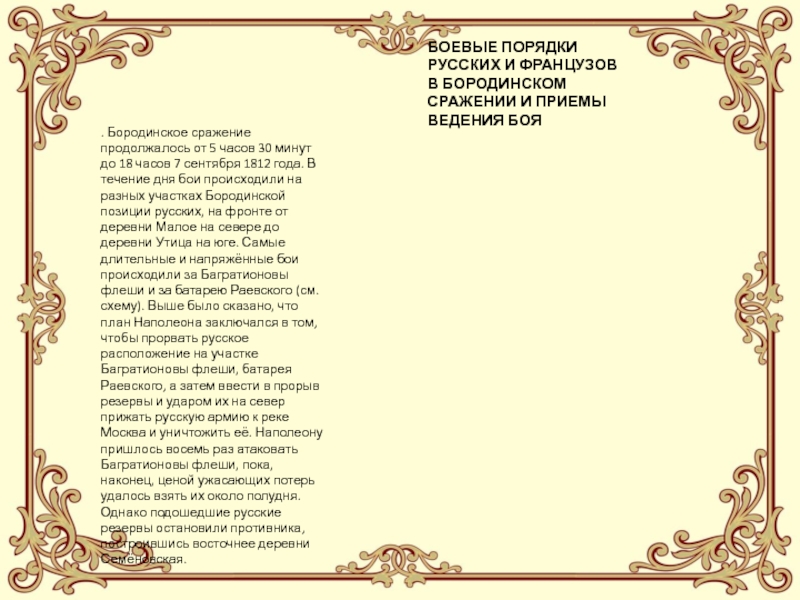 . Бородинское сражение продолжалось от 5 часов 30 минут до 18 часов 7 сентября 1812 года. В течение дня бои происходили на разных участках Бородинской позиции русских, на фронте от деревни Малое на севере до деревни Утица на юге. Самые длительные и напряжённые бои происходили за Багратионовы флеши и за батарею Раевского (см. схему). Выше было сказано, что план Наполеона заключался в том, чтобы прорвать русское расположение на участке Багратионовы флеши, батарея Раевского, а затем ввести в прорыв резервы и ударом их на север прижать русскую армию к реке Москва и уничтожить её. Наполеону пришлось восемь раз атаковать Багратионовы флеши, пока, наконец, ценой ужасающих потерь удалось взять их около полудня. Однако подошедшие русские резервы остановили противника, построившись восточнее деревни Семёновская.
