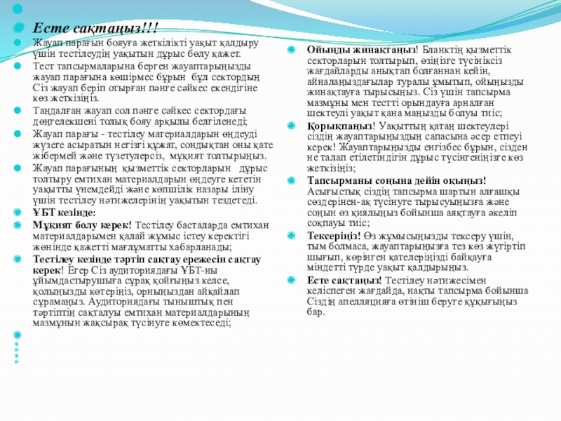 Қорықпаңыз! Уақыттың қатаң шектеулері сіздің жауаптарыңыздың сапасына әсер етпеуі керек! Жауаптарыңызды енгізбес бұрын, сізден не талап етілетіндігін дұрыс түсінгеніңізге көз жеткізіңіз;