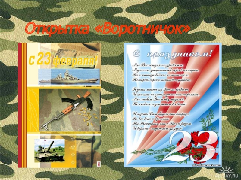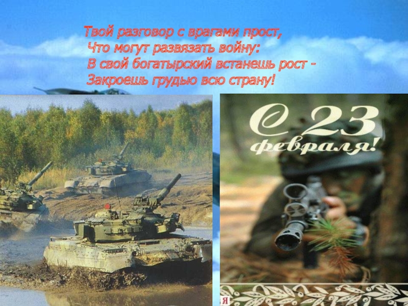 Среди февральских холодов Мы поздравляем в этот час Тебя - всегда ты в бой готов - Защитник Родины и нас!