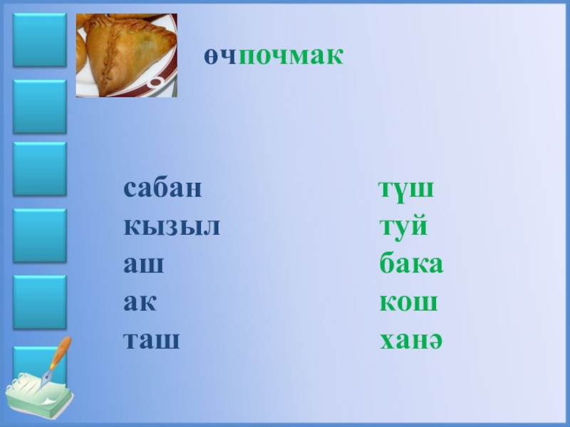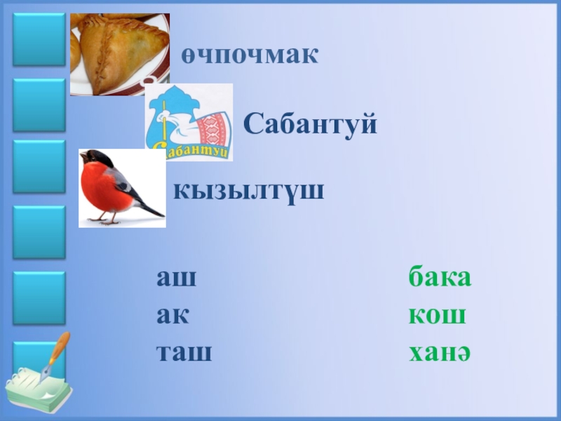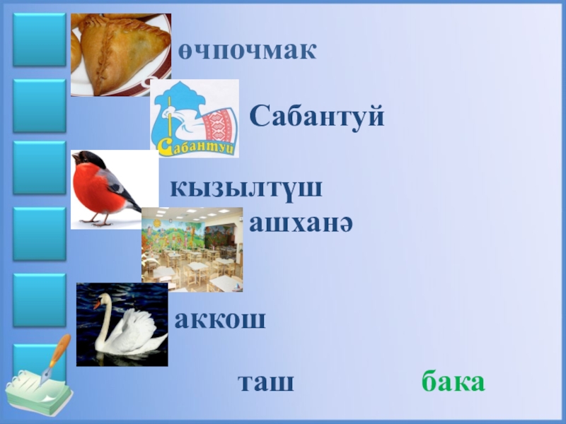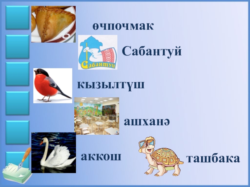 Елга, күл, тимераяк, куян, таяк, ташбака.