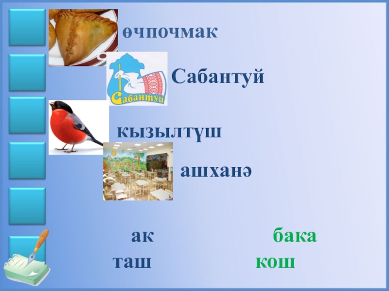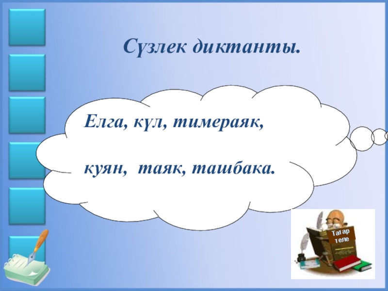 Сүзлек диктанты.Елга, күл, тимераяк, куян, таяк, ташбака.Татар теле