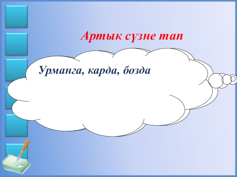 Артык сүзне тапУрамда, елгада, күлдән.Урманга, карда, бозда
