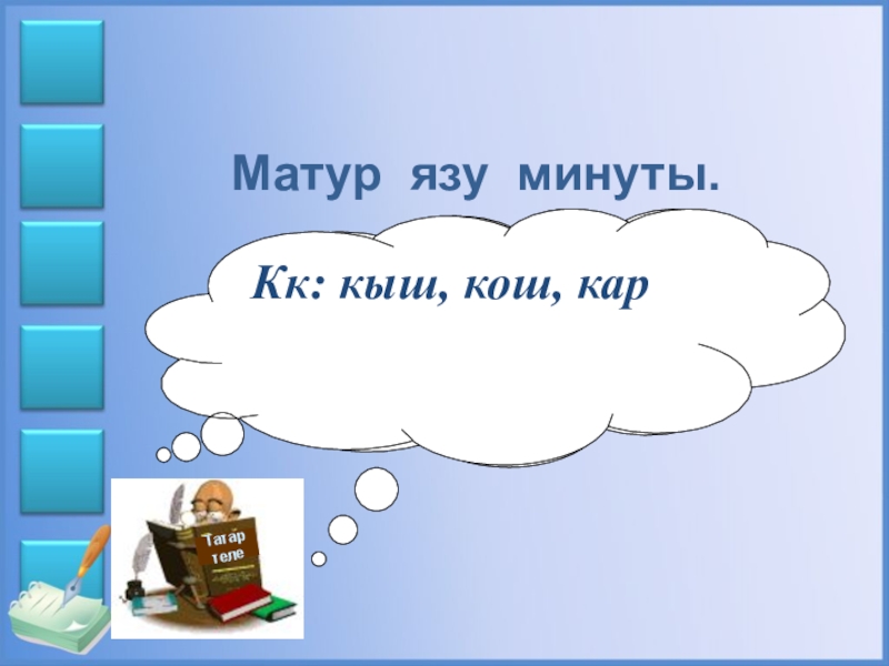 Матур язу минуты.Табышмакның җавабын тап !Салкын саф һава,Йомшак кар ява.Урамга чыксаң,Битләр кызара.Бу кайчан була?Кк: кыш, кош, кар