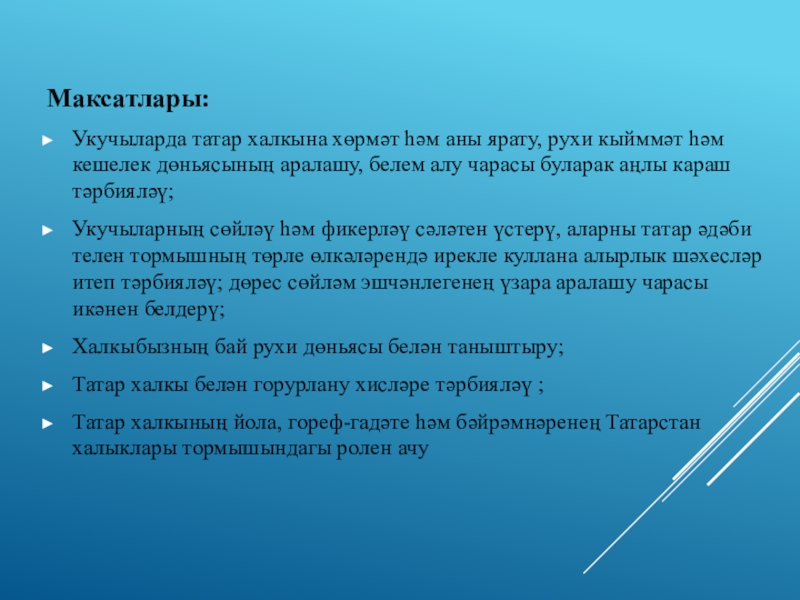 Татар теле һәм әдәбияты укытучысының төп максаты - белем һәм тәрбия бирү процессында милли үзаң формалаштыру. Бу иң беренче чиратта үз телеңне, халкыңның гореф – гадәтләрен, милли йолаларын, мәдәниятен яхшы белү булса, икенчедән башка халыкларның да телен, мәдәниятен өйрәнү .