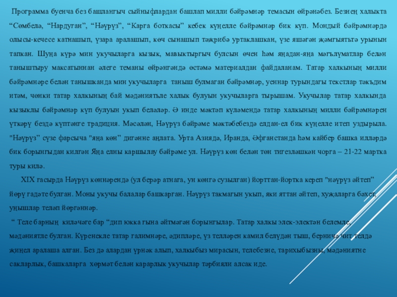 Слайд 16 Программа буенча без башлангыч сыйныфлардан башлап милли бәйрәмнәр темасын өйрәнәбез.